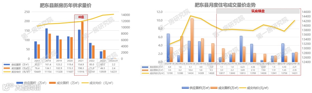根据AI楼市数据显示,按备案数据计算,肥东县近7年新房年均供应110.94万㎡,年均成交106.36万㎡,需求大于供应,成交均价11704元/㎡。2018年起,肥东县商品房市场成交量价总体呈稳定态势;2021年上半年,受合肥市区带动,成交量继2016年后再创新高,达到峰值;伴随全国市场大环境下行,作为合肥卫星城市的肥东众多板块属于城市边缘板块,叠加市区放开限购,肥东市场遇冷明显,但历年成交均价稳步上扬。2023年供应40.18万㎡,成交46.52万㎡,成交均价13939元/㎡,需求大于供应。分月度来看,2023年6月至今,市场长期处于筑底横盘阶段。