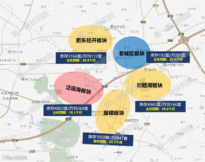 库存方面,肥东县广义总存量13912套,月均700套,理论去化周期19.9个月。整体存量偏高,但去化周期相对可控。其中泛瑶海板块去化周期最短、流速第一;老城区板块存量最小;撮镇板块虽然存量整体不大,但去化周期较长,市场客户接受度不高。和睦湖板块、肥东经开区板块流速第二但存量较大,单盘流速30套左右,在当前市场情况下,和睦湖板块仍然表现出了较强的韧性。