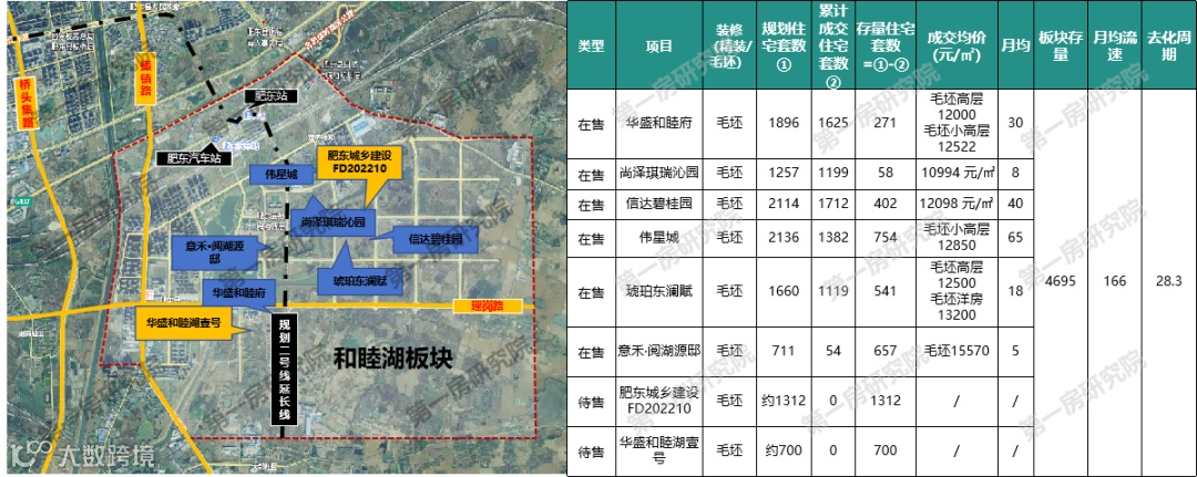 和睦湖板块目前在售及待售项目8个,其中在售项目6个,待售项目2个。板块总存量4695套,板块月均流速166套,单盘月均流速32套左右,去化周期28.3个月,存量去化周期较长,单盘流速较慢。受市场下行的影响,刚需客户观望情绪严重,市场下行明显。