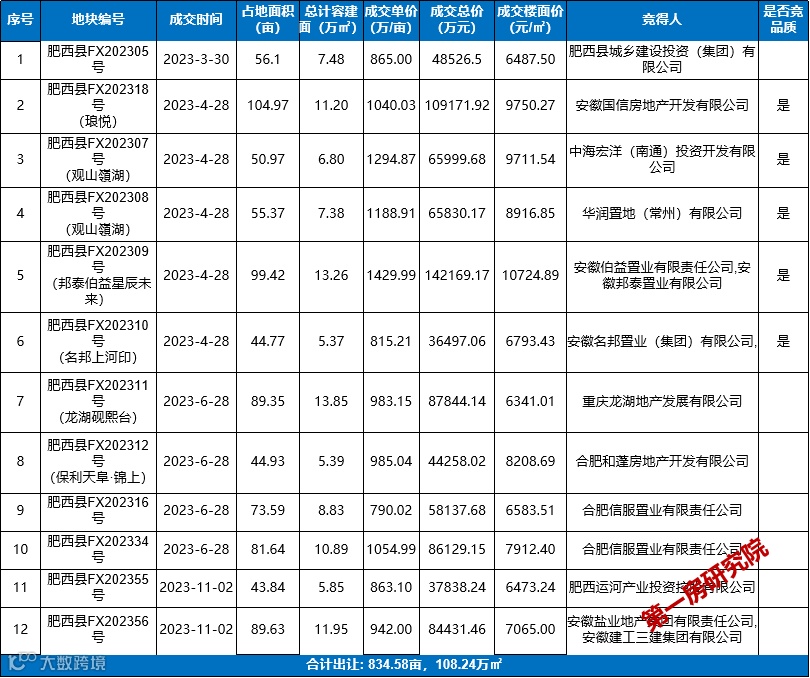 2023年肥西共成交12宗涉宅用地,其中,中派片区4宗,泛高新和老城区各3宗,紫云湖和泛经开各1宗,12宗地块5宗进入竞品质阶段。