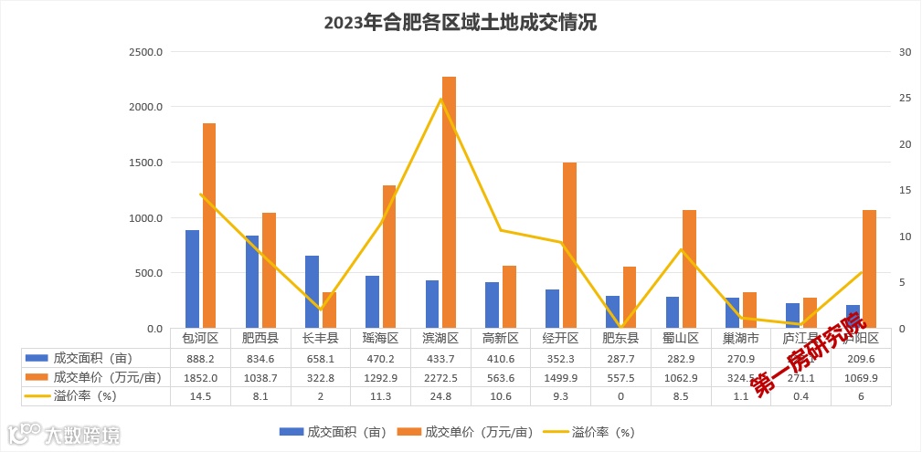 2023年合肥土地成交5320.9亩,成交单价1110.9万元/亩,平均溢价率12.1%。肥西县成交834.6亩,仅次于包河区,排名第二;成交单价四县一市排名第一,突破1000万元/亩;溢价率8.1%,也是四县一市中第一,由此也看出,房企对肥西市场看好。