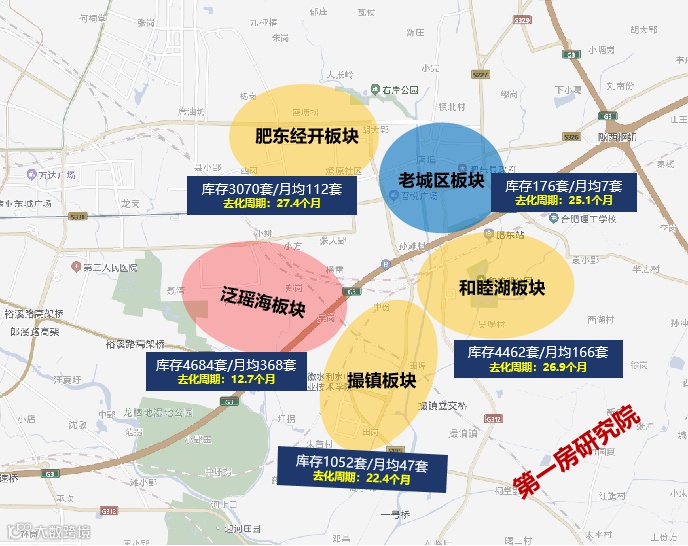 板块方面,泛瑶海板块认知最高,板块新房流速第一,去化周期最短。老城区土地稀缺,新房市场竞争压力较小,板块内存量最小。和睦湖和肥东经开同是城市外拓的新兴板块,和睦湖板块还是合肥城市副中心,新政务中心,两板块存量大,去化周期长。撮镇板块是城市边缘板块,虽然存量整体不大,市场客户接受度不高,去化周期较长。