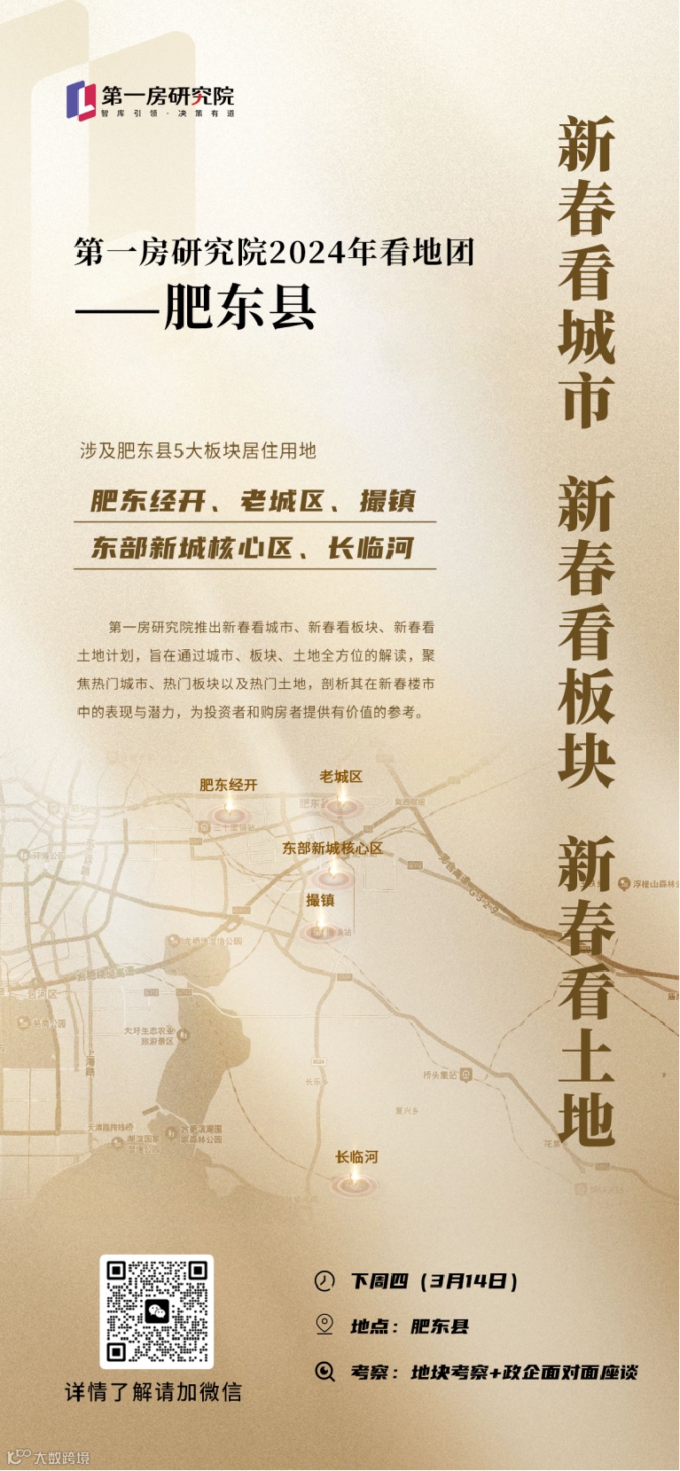 拟定下周四(3月14日)下午,由第一房研究院组织的新春看土地肥东站正式举行,本次看地主要涉及肥东老城区、撮镇、长临河、肥东经开、东部新城核心区五大板块居住用地。看地结束后将会举行小型座谈会,面对面政企交流。