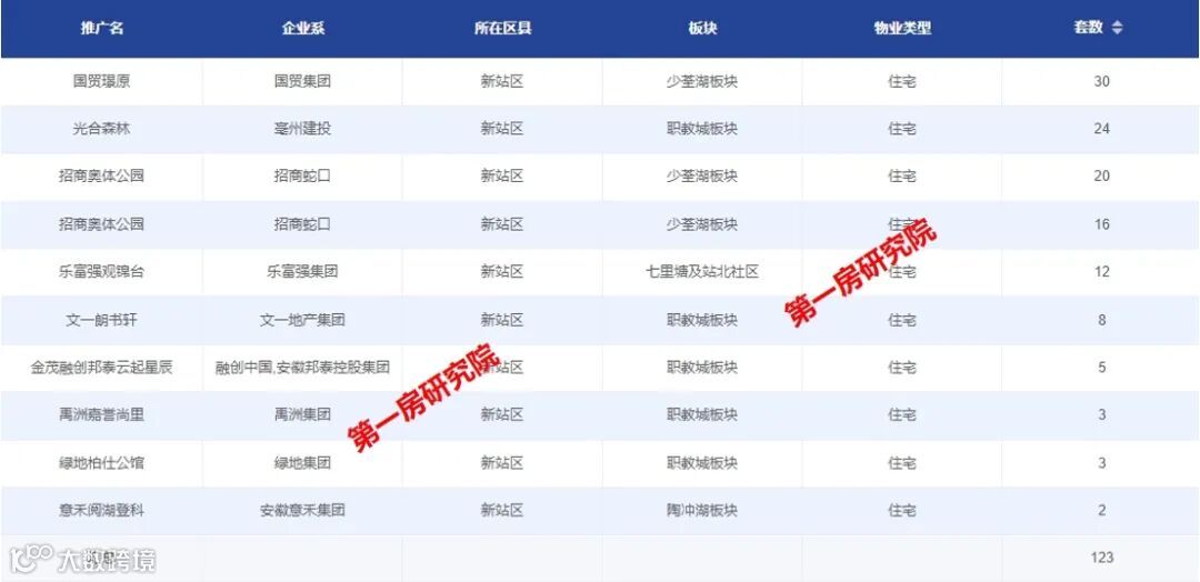 据第一房研究院Ai楼市指数系统显示,3.1-3.24日新站区新房共计成交123套,其中一半以上来自少荃湖板块。TOP3楼盘里中,少荃湖板块楼盘占据2席,分别为国贸璟原和招商奥体公园。