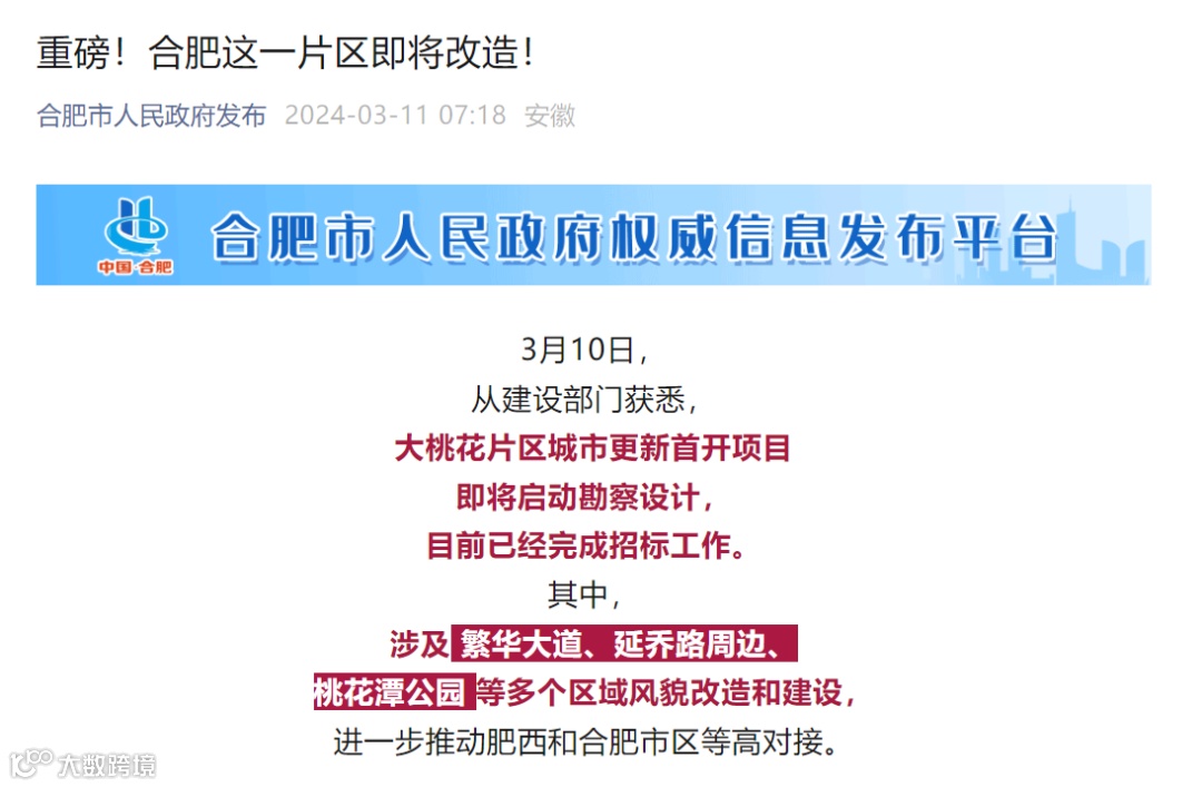 合肥又一片区重大改造,涉及繁华大道、延乔路周边、桃花潭公园等多个区域风貌改造和建设,进一步推动肥西和市区等高对接。