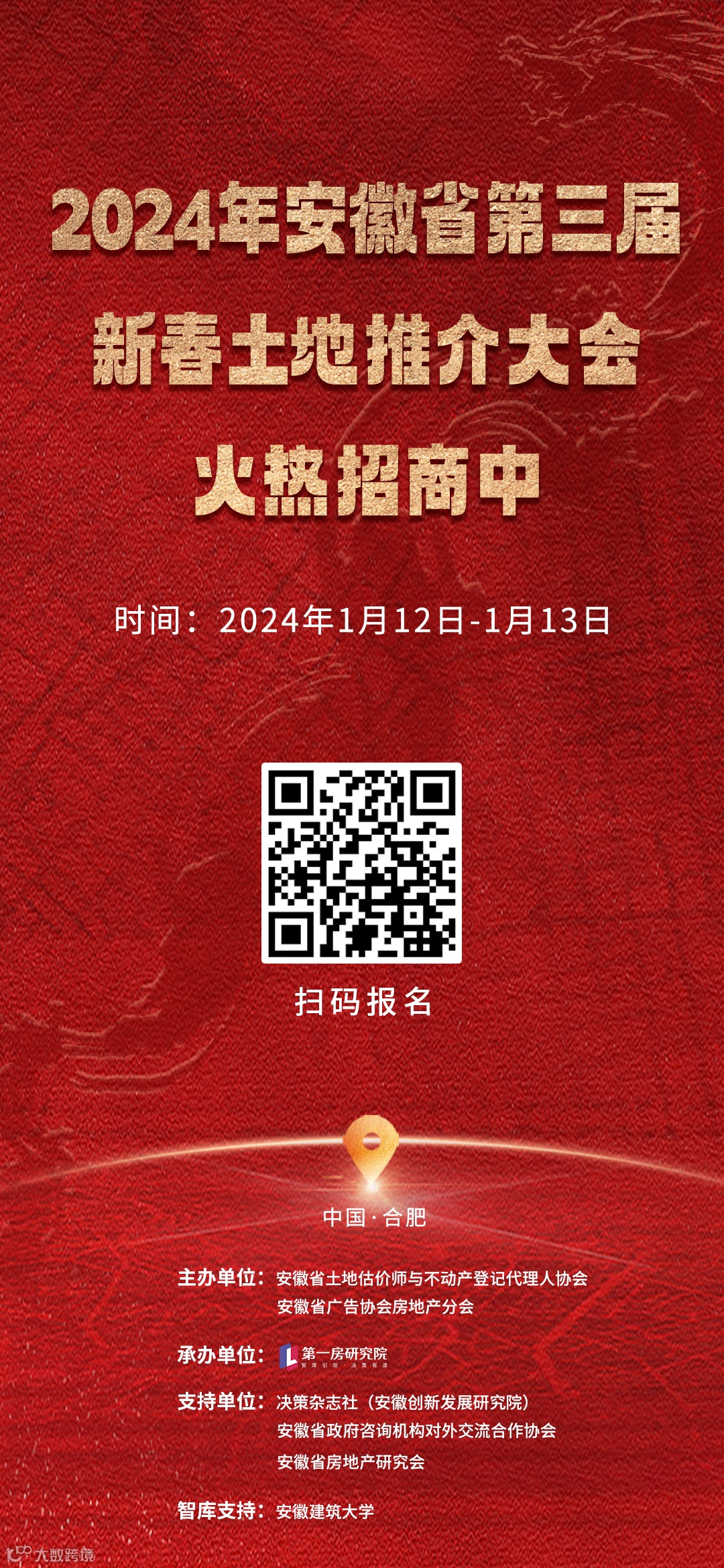 2024年1月11日-1月13日,由安徽省土地估价师与不动产登记代理人协会、安徽省广告协会房地产分会主办,第一房研究院承办,决策杂志社(安徽创新发展研究院)、安徽省政府咨询机构对外交流合作协会支持,安徽建筑大学智库支持的第三届安徽省新春土地推介大会将在合肥丰大国际大酒店举办,届时将会公布2024年供地计划。
