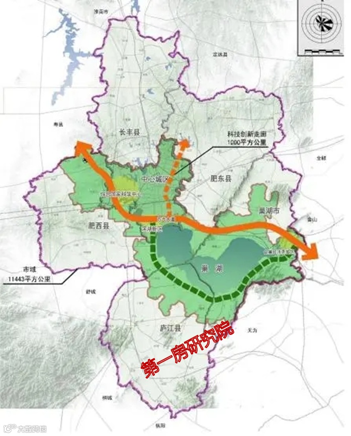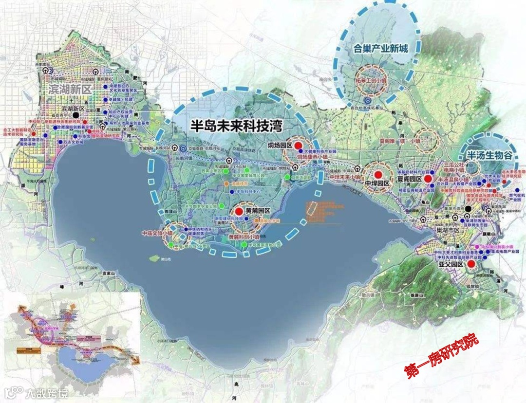 一城(滨湖科学城):依托综合国家科学中心,建设全国产业创新平台和世界一流的大科学装置群、科研机构和学科专业,是环巢湖科创走廊核心区。