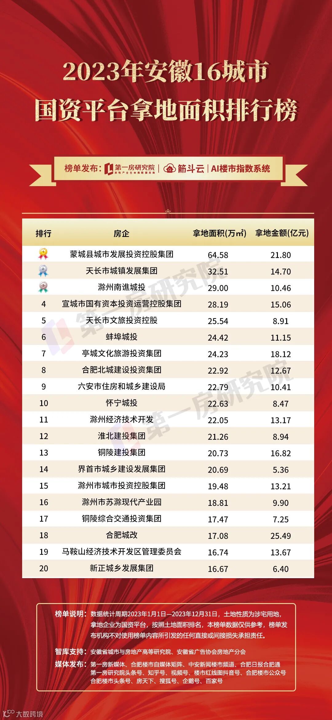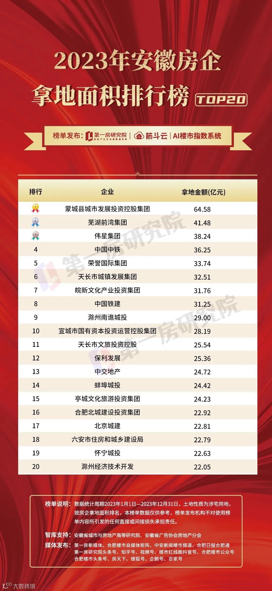 2023年安徽房企拿地面积榜单排行榜