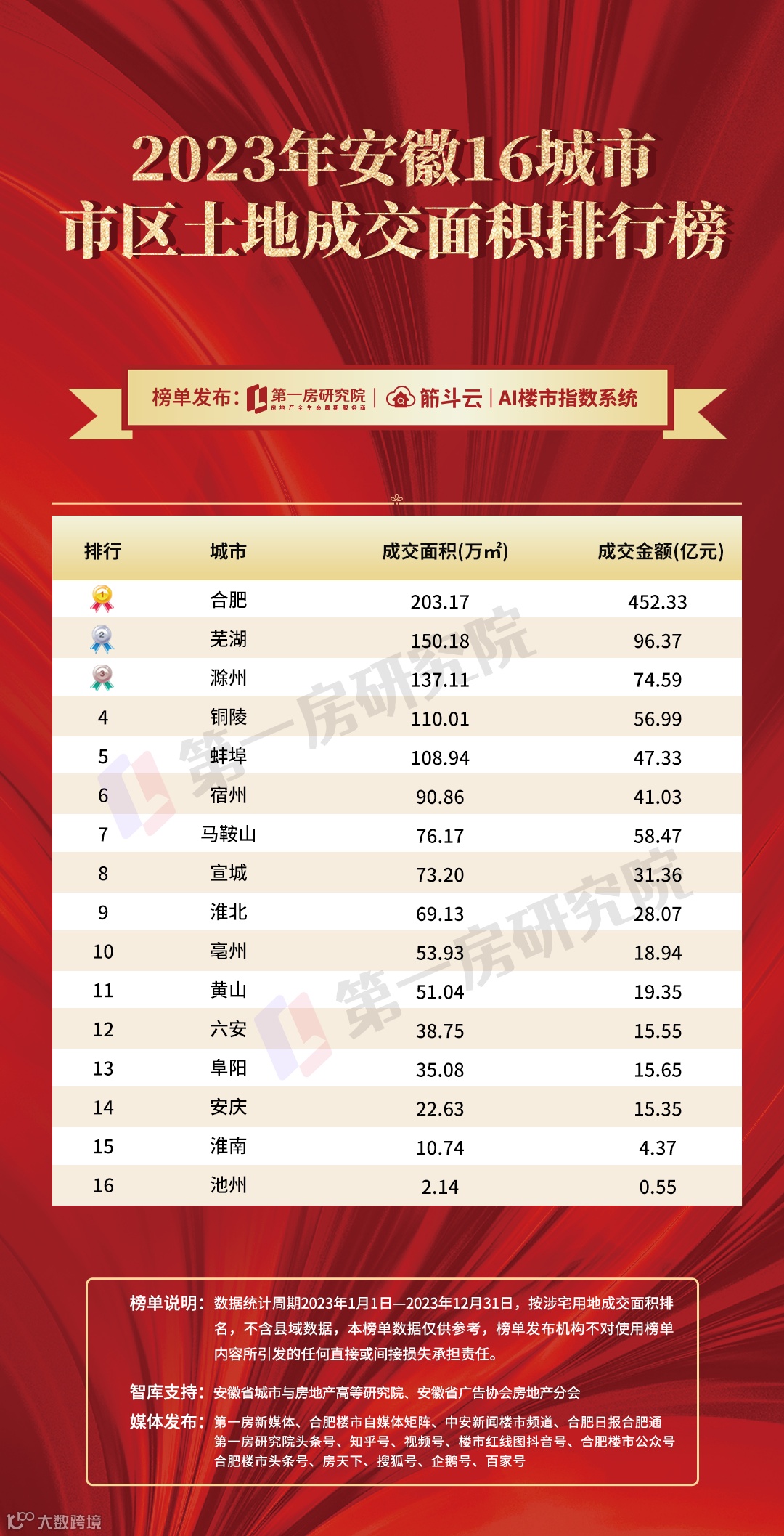 2023年安徽16城土地成交面积排行榜