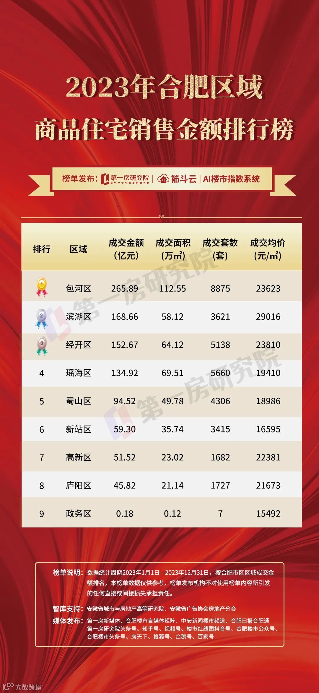 2023年,房地产市场深度调整,供求关系发生重大变化,同时也是“政策大年”,各种利好政策频出。数据说话,榜单引领,2023年安徽省房地产市场到底如何,下面将从合肥九区新房成交量价、房企、楼盘及安徽土地成交情况详细解说。
