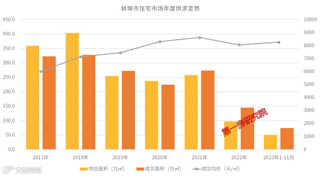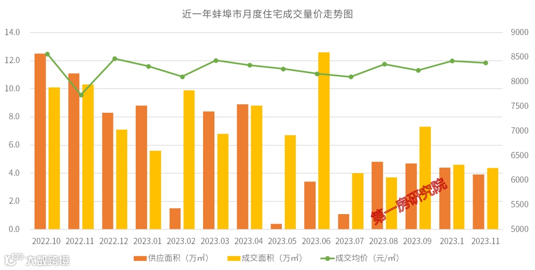 从今年的月度成交走势来看,整体市场成交量下滑,成交未见回暖,价格相对稳定,市场仍在筑底修复。2023年11月蚌埠供应3.9万㎡,成交4.4万㎡,成交均价8385元/㎡,均价环比微跌0.5%。