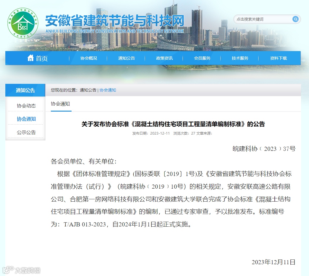 12月11日,安徽省建筑节能与科技网发布协会通知关于发布协会标准《混凝土结构住宅项目工程量清单编制标准》的公告,标志着由安联高速公路有限公司、第一房研究院、安徽建筑大学联合编制的团体标准正式发布!