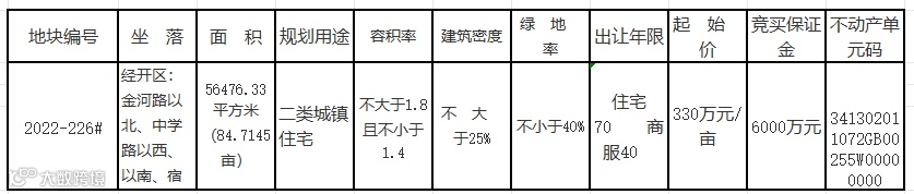 2022-226#地块要求:1、竞买人须为公司法人。2、竞得人须无偿同步代建地块内西侧公共通道,建成后移交经开区(鞋城)管委会,并对社会开放。3、竞得人须自成交之日起10个工作日内签订项目地块《国有建设用地使用权出让合同》,因竞得人自身原因,逾期未签订的终止供地,竞买保证金不予返还。竞得人注册所在地位于宿州市境外的(属宿州市境内企业,如需在项目所在地辖区内另行注册全资子公司的,须在报名时作出书面申请),须自成交之日起40日内在项目所在地设立一个有法人资格的全资子公司并由其与市自然资源和规划局签订《国有建设用地使用权出让合同变更协议》,竞得人及其全资子公司对宗地出让文件、《国有建设用地使用权出让合同》及《国有建设用地使用权出让合同变更协议》的权利、义务互负连带责任。4、竞买人在办理竞买登记手续时,须书面承诺“已认真阅读该宗地相关出让文件并自愿受其约束,对土地现状充分了解无异议,愿意在约定时间内现状接受土地,签订《国有建设用地交付确认表》,不对宗地现状交付和相关出让文件有异议或提出抗辩”。5、竞买人竞得土地后,须按规划条件通知书、《宿州市控制性详细规划通则》和出让合同约定的容积率进行开发建设,不得擅自改变,未经批准,擅自提高容积率的,超容积率部分无偿收回或按规定补缴土地出让金并作处罚。6、竞得人可以选择分期付款方式支付土地出让金,竞买保证金直接转为首期土地出让金且首期(合同签订之日起1个月内)缴纳比例不低于总价款的50%,1年内缴清全部出让价款。分期支付出让价款的,竞得人在支付第二期及以后各期出让价款时,须按照支付第一期土地出让价款之日中国人民银行公布的