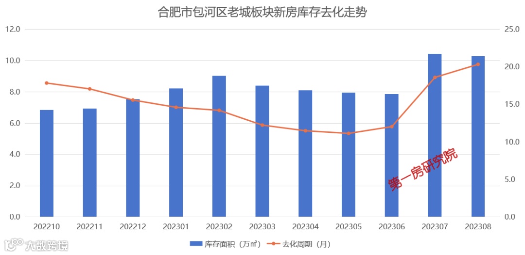截止到10月份,合肥市包河区老城区板块新房库存为10.3万㎡,去化周期为20.3个月,因项目少流速低,导致去化周期虚高。