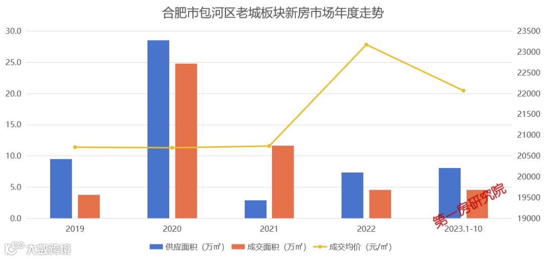 近4年包河老城板块新房市场年均供应12.1万㎡,年均成交11.2万㎡,供略大于求,成交均价也在稳步攀升。今年1-10月份累计供应8.1万㎡,成交4.6万㎡,成交均价22070元/㎡,主要受市场在售项目影响较大。