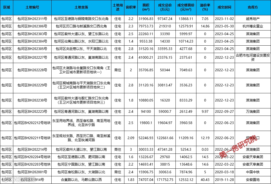 合肥土地市场冷热分明,作为四大老城之一的包河区,包河老城区供地较小,主要以城市更新及安置房为主。该板块的土地成交集中在2022年,累计出让了10宗涉住地块,其中6宗地块为城市更新及安置房用地,其余4宗地块楼面价大多超过了1.2W元/㎡,最高楼面价达1.4W元/㎡, 而今年成交的5宗地块,除滨湖集团定向3宗地块外,越秀和杭州椿实两宗地块楼面价均超1.2W元/㎡。