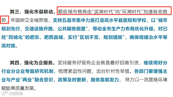 顺应城市格局由“滨湖时代”向“环湖时代”加速转变趋势,牢固树立全域思维,支持五县市集中力量打造高水平县医院和学校,以“城市规划先行、交通设施开路、公共服务前置”,带动全市生产力布局优化升级。对已经“同城化”的肥东、肥西县城,实行“区划不变、规划提级”,确保规建治水平等高对接。