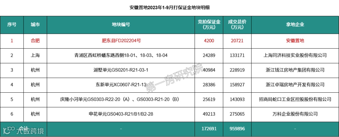 根据AI楼市大数据显示,安徽置地安徽置地2023年1-9月累计参拍地块6宗合计打保证金约17.3亿元,涉及合肥、上海、杭州三个城市,从土拍报名打保证金的明细不难看出,安徽置地下一步正在筹划积极布局杭州。或许,杭州将是置地下一个准备深耕的城市之一,同时兼顾关注、探索上海土地布局。遗憾的是,安徽置地前三季度未能在杭州、上海落子。2023年1-9月累计摘地1宗,为FD202204号地块,位于去年安徽置地摘得的长临河商业地块旁,肥东FD202204号地块容积率≤1.2,是合肥为数不多的超低容积率住宅产品。