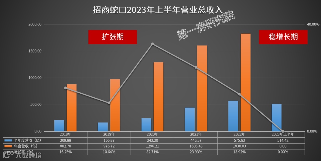 根据招商蛇口2023年半年报显示,上半年招商蛇口实现营收514.42亿,同比下滑10.63%;纵观近6年招商蛇口营收情况,2018-2022年 属于企业扩张期,企业营收快速增长,进入2023年,企业以稳增长为主。