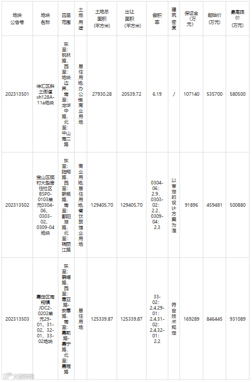根据国家有关法律、法规和《招标拍卖挂牌出让国有建设用地使用权规定》、《上海市土地使用权出让办法》等规定,发布涉及徐汇区、宝山区、嘉定区3个地区共计3幅国有建设用地使用权。有关情况公告如下: