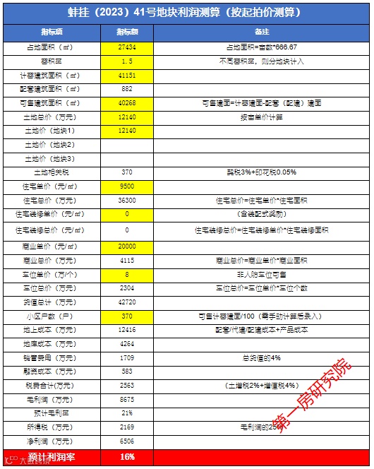 考虑到地块本体容积率为1.5,相对较低,方案可排一些高溢价的低密度改善型产品。参考价按照毛坯均价9500元/㎡,起拍价下初步计算的结果为净利润16%,利润空间较为可观。