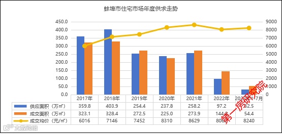 2023年1-7月蚌埠住宅供应32.5万㎡,成交54.4万㎡,成交均价8240元/㎡。