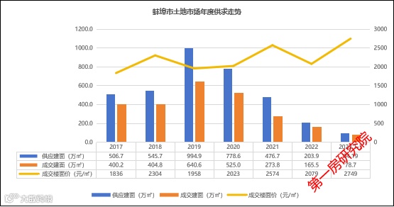 蚌埠近6年土地年均供应584万㎡,年均成交401万㎡,供应成交率68.7%,平均楼面价2088元/㎡。2023年1-7月蚌埠市成交7宗涉住地块,计容建面78.7万㎡,成交楼面价2749元/㎡。