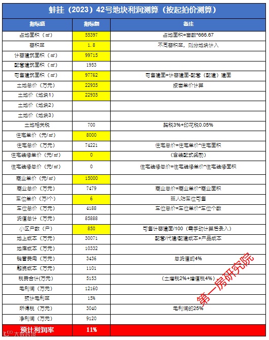 参考周边竞品项目均价,按照毛坯均价8300元/㎡,起拍价下初步计算的结果为净利润22%,利润空间较为可观。
