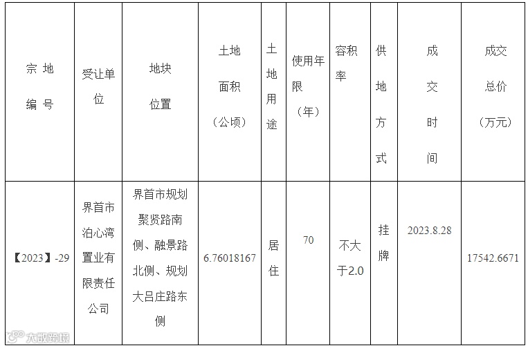 根据界自然资公告字﹝2023﹞19号公告之规定,我局于2023年7月27日至2023年8月28日通过挂牌方式成交一宗国有建设用地使用权。现将成交结果予以公示:
