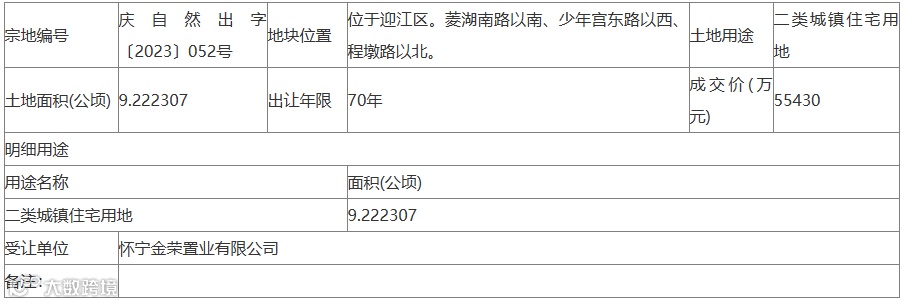 怀宁金荣置业竞得安庆1宗居住用地,成交金额5.543亩