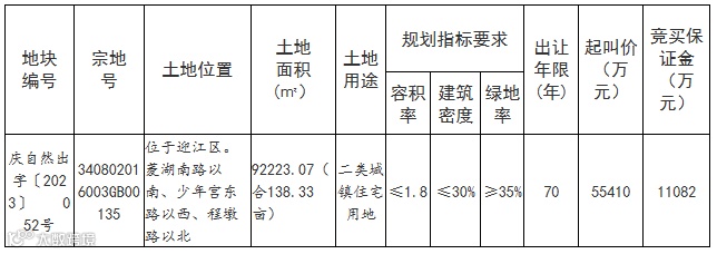 安庆暂定9月22日拍卖1宗居住用地,面积138.33亩