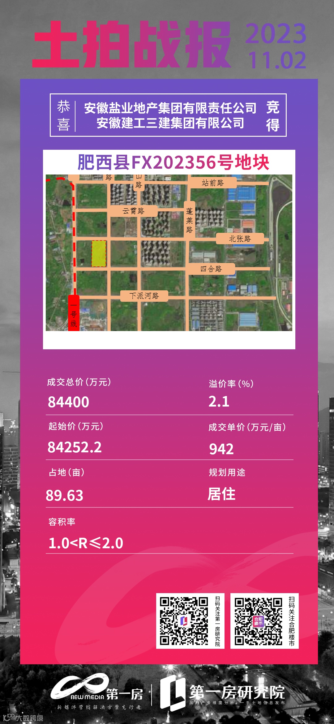 肥西县FX202356号居住用地被安徽盐业地产集团&安徽建工三建集团夺得,成交单价942万元/亩,楼面价7064.96元/平米,总价84431.46万元,溢价率0.21%。