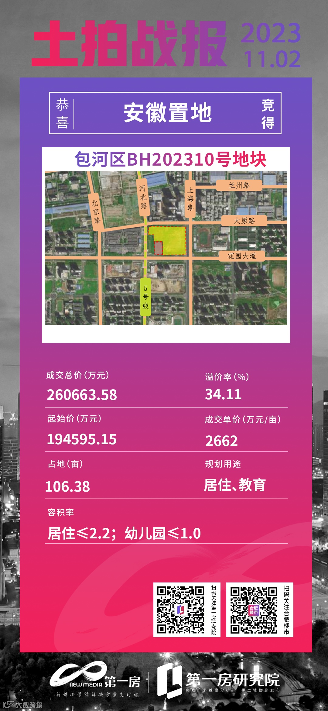 2023年11月2日,合肥土拍成交11宗地块,总成交面积约1045亩,其中市区5宗,滨湖1宗、包河2宗、蜀山1宗安置房和高新1宗租赁住房,肥西2宗,长丰2宗,巢湖和庐江各1宗,成交总金额达105.89亿元。