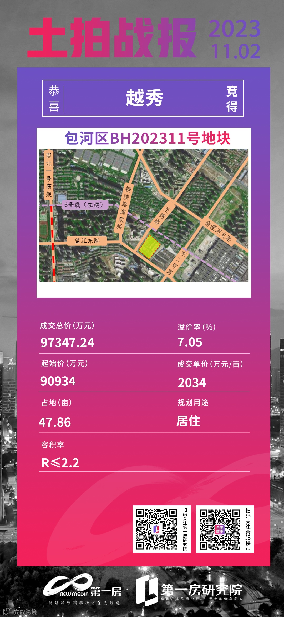包河区BH202311号地块意向房企4家,分别为保利、合肥城建、越秀、龙湖。最终越秀以9.73亿元成交,成交单价2034万元/亩,居住楼面价13868.18元/㎡,溢价率7.05%。