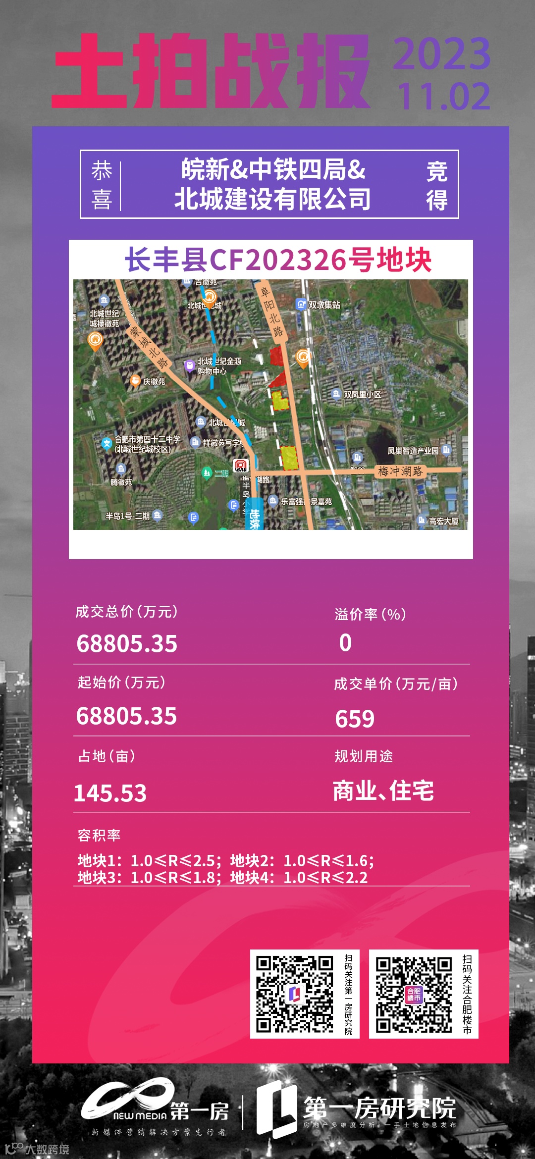 长丰县CF202326号商住用地:居住用地成交单价659万元/亩,最高楼面价5491.64元/平米,总价68805.35万元,溢价率0.00%。