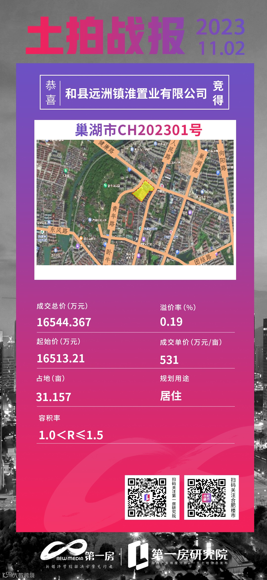 巢湖市CH202301号居住用地被和县远洲镇淮置业有限公司竞得,成交单价531万元/亩,楼面价5309.46元/平米,总价16544.367万元,溢价率0.18%。
