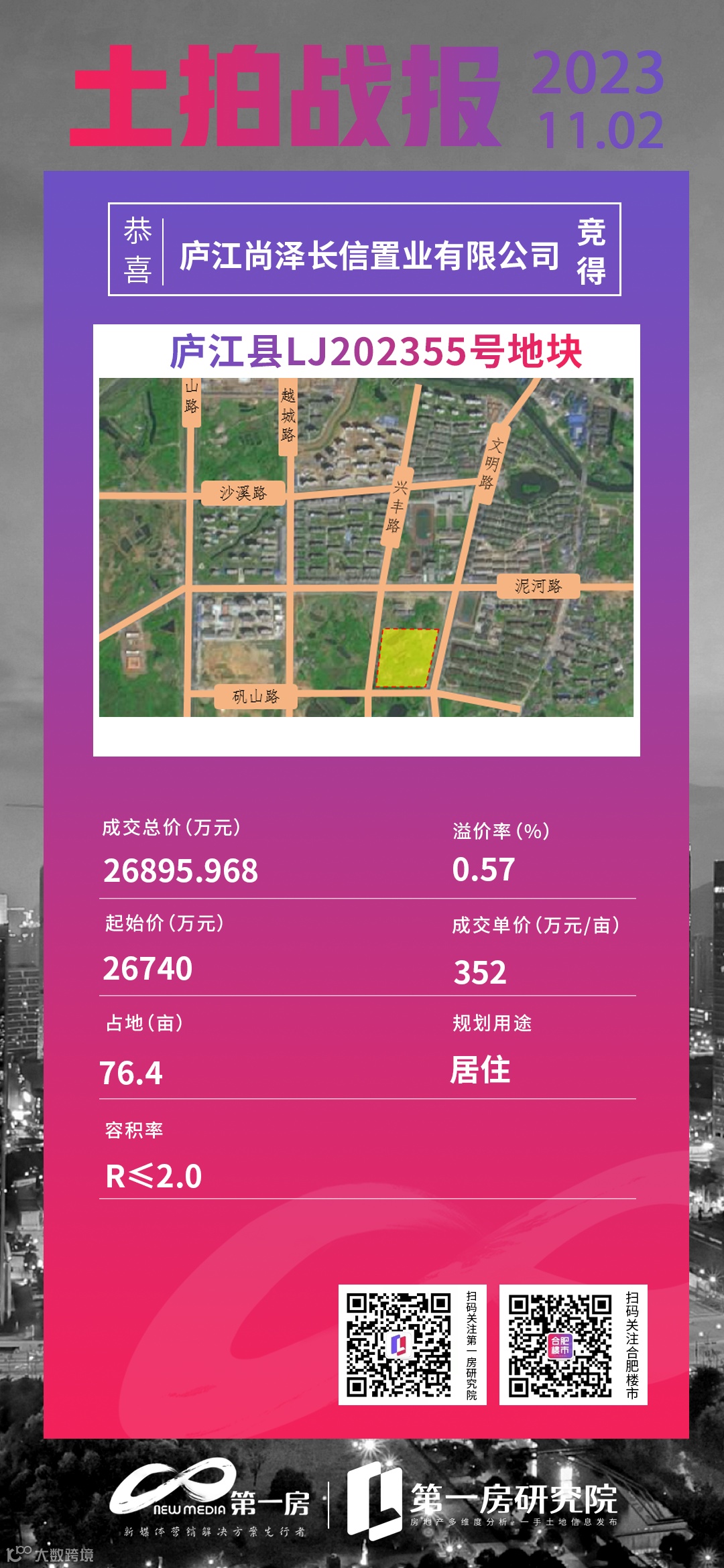 庐江县LJ202355居住用地被尚泽竞得,成交单价352万元/亩,楼面价2639.99元/平米,总价26895.968万元,溢价率0.57%。