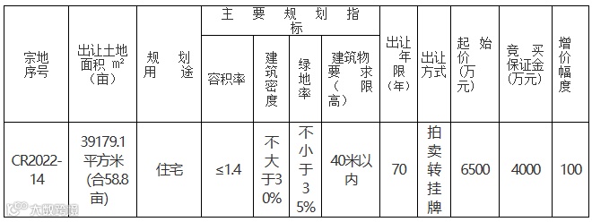 CR2022-14号宗地以拍卖转挂牌方式公开出让,并设有底价,不达到底价不能成交。至拍卖竞买报名缴纳保证金截止