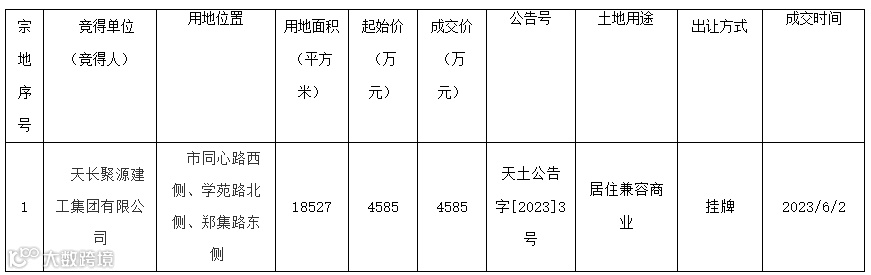 2023年6月2日,天长市自然资源和规划局在市公共资源交易中心公开出让1宗商住用地,成交1宗。根据原国土资源部《招标拍卖挂牌出让国有建设用地使用权规定》的要求,现将成交结果公告如下:
