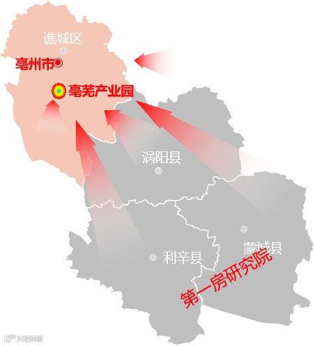 亳州市区位于亳州北部区域,南面分别为涡阳县、利辛县、蒙城县,而亳芜产业园位于市区南面,介于市区与县域中间,区位上有一定优势,对周边有虹吸效应,县域到市区置业首先经过亳芜产业园。