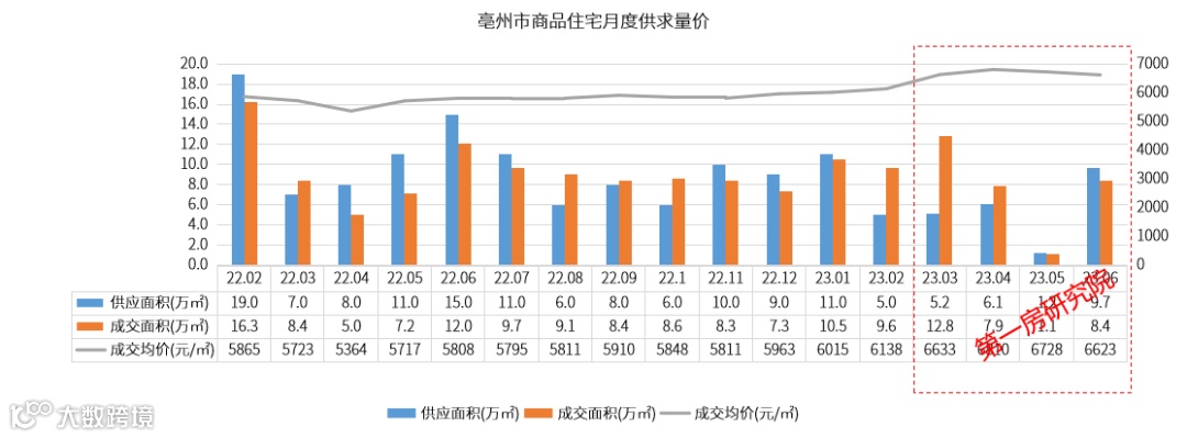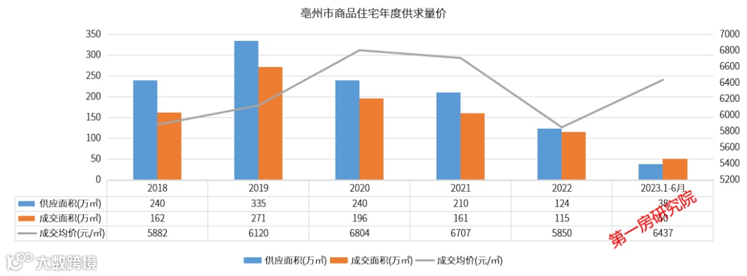 亳州市区2023年1-6月供应38万㎡,成交50万㎡,需求大于供应,成交均价6437元/㎡,整体上半年市场上行。分月度来看,从2023年3月开始,市场逐步下滑,成交均价稳中有升。据官网数据统计,亳州2023上半年商品房销售面积增长16.2%,全省排名第一。