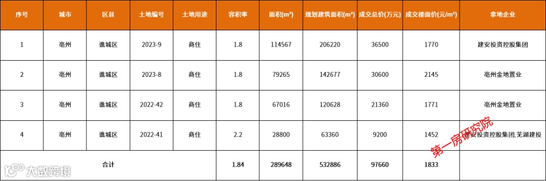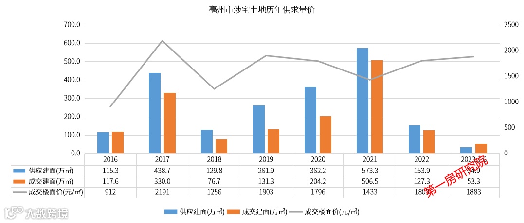 2023年上半年亳州市区共成交4宗涉宅用地,占地约800亩,成交楼面价1833元/㎡。