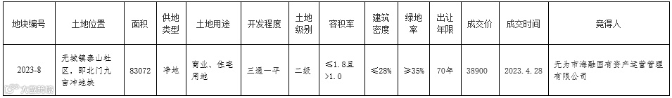 无为市海融国有资产运营管理有限公司拿下无为市1宗商住用地