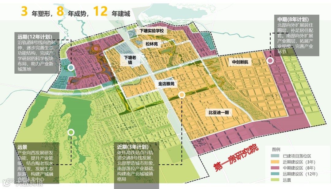 产业高速发展的同时,政府也开始注重生活氛围的铸造,作为合肥新能源汽车三大基地之一,面临着“有产无城、有镇无城”的局面,故而政府定下了“圈层开发,产城并进,先东后西”的发展策略,着力3 年塑形,8 年成势,12 年建城,以求达到以业兴城。