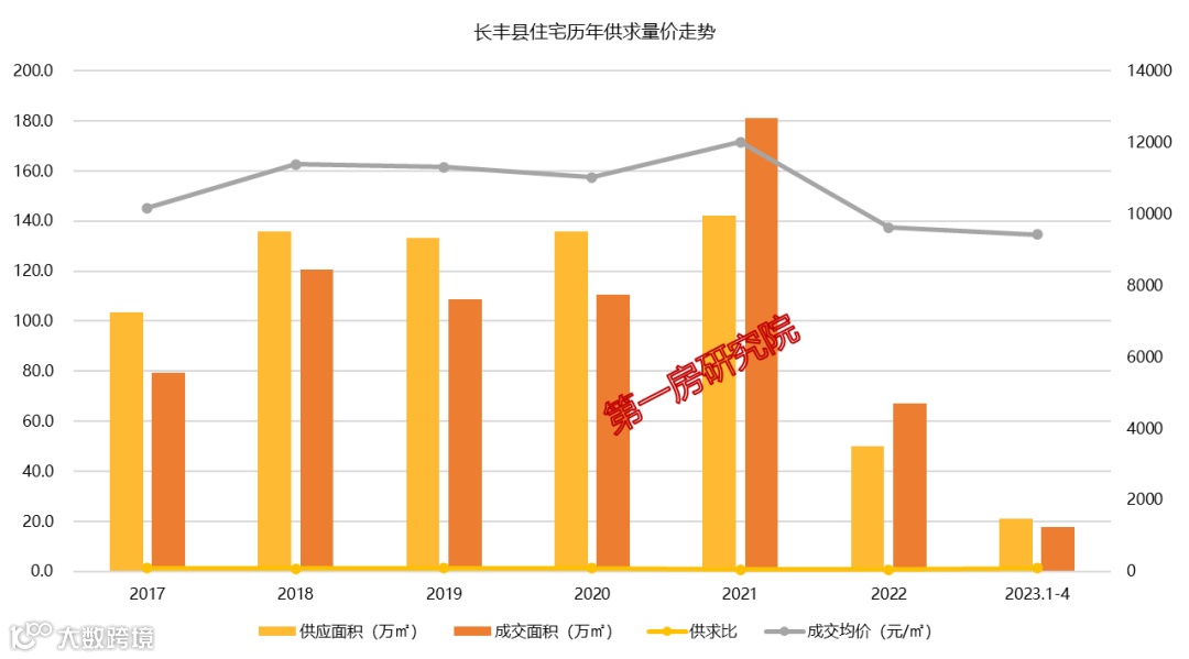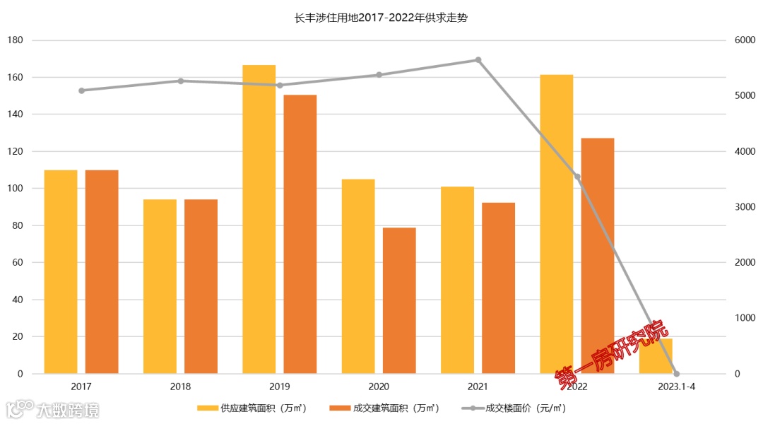 近六年长丰县年均供应涉住建面123.1万㎡,成交108.8万㎡,平均楼面价为4954元/㎡。2022年,长丰县土地市场成交楼面价虽然降低了37.2%,但供应和成交量都有明显上涨。
