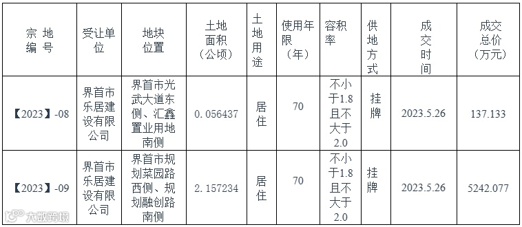 界首市乐居建设有限公司拿下界首两宗居住用地,总成交价5379.21万元