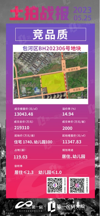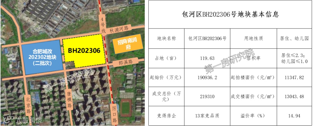 包河BH202306号地块13家参拍,13家竞品质。地块成交单价2000万元/亩,成交总价219310万元,住宅楼面价13043.48元/㎡,溢价率14.94%。