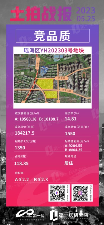 瑶海区YH202303号地块15家参拍,14家竞品质。地块成交单价1550万元/亩,成交总价184217.5万元,居住楼面价A地块:10568.18元/㎡,B:10108.70元/㎡,溢价率14.81%。