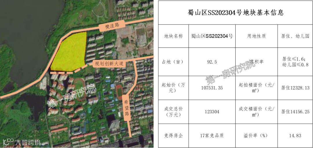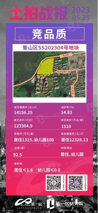 蜀山区SS202304号地块17家参拍,17家竞品质。地块成交单价1510万元/亩,成交总价123304.9万元,居住楼面价14156.25元/㎡,溢价率14.83%。