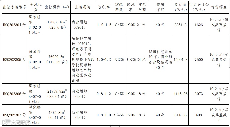 (五)HSQ202304号地块监管人为谭家桥镇人民政府,竞得人自签订成交确认书5日内同监管人签订《监管协议》,10个工作日内签订出让合同。竞得人需保证:①该宗地投资额不低于6144万元;②该宗地投资强度不低于240万元/亩;③该宗地亩均税收不低于6.4万元/年;④竞得人须自持不少于10%的计容建筑面积,且不得销售、转让及抵押。HSQ202306号地块监管人为谭家桥镇人民政府,竞得人自签订成交确认书5日内同监管人签订《监管协议》,10个工作日内签订出让合同。竞得人需保证:①该宗地投资额不低于7834万元;②该宗地投资强度不低于240万元/亩;③该宗地亩均税收不低于6.4万元/年;④竞得人须自持不少于10%的计容建筑面积,且不得销售、转让及抵押。HSQ202307号地块监管人为谭家桥镇人民政府,竞得人自签订成交确认书5日内同监管人签订《监管协议》,10个工作日内签订出让合同。竞得人需保证:①该宗地投资额不低于1539万元;②该宗地投资强度不低于240万元/亩;③该宗地亩均税收不低于6.4万元/年;④竞得人须自持不少于10%的计容建筑面积,且不得销售、转让及抵押。